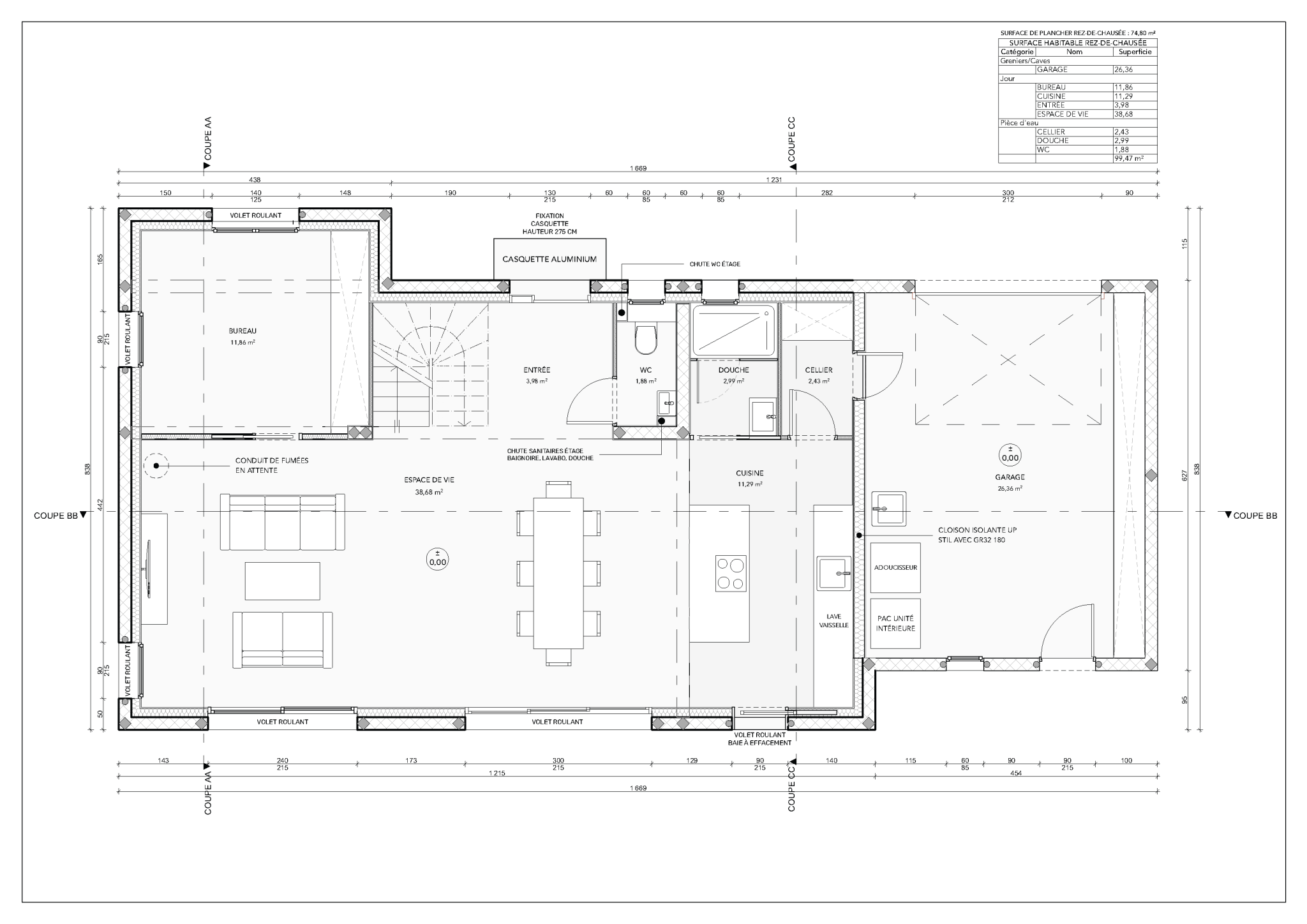 Édifiée sur deux niveaux (R+1), elle développe 122 m2 habitables, complétés par un garage attenant de 26 m2.