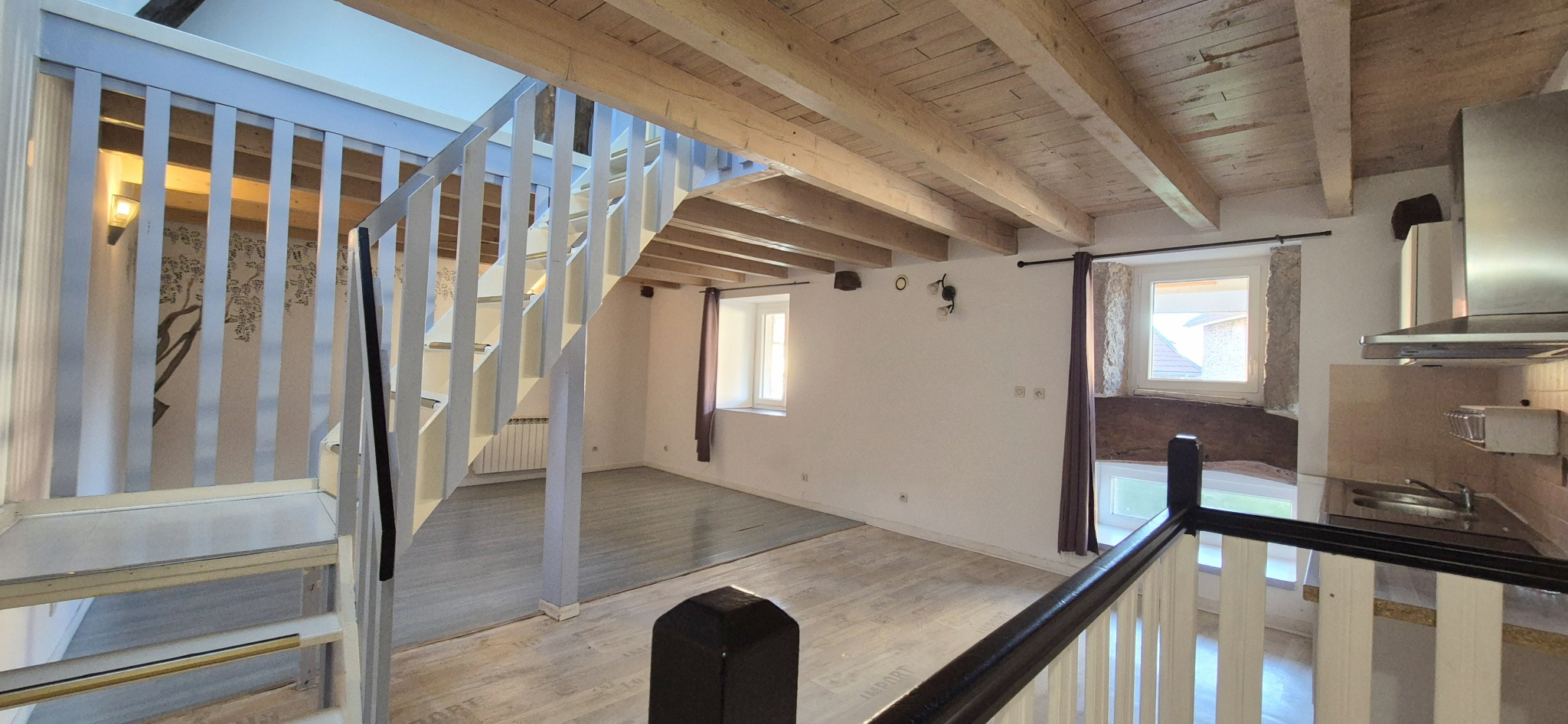 À l’étage, la pièce de vie d’environ 31 m² séduit par son bel espace lumineux et convivial. Cet espace unique, regroupant salon, salle à manger et cuisine ouverte, constitue un véritable lieu de partage. Le charme de la pierre et les volumes bien pensés offrent une atmosphère chaleureuse et accueillante, idéale pour un jeune couple ou un premier achat.