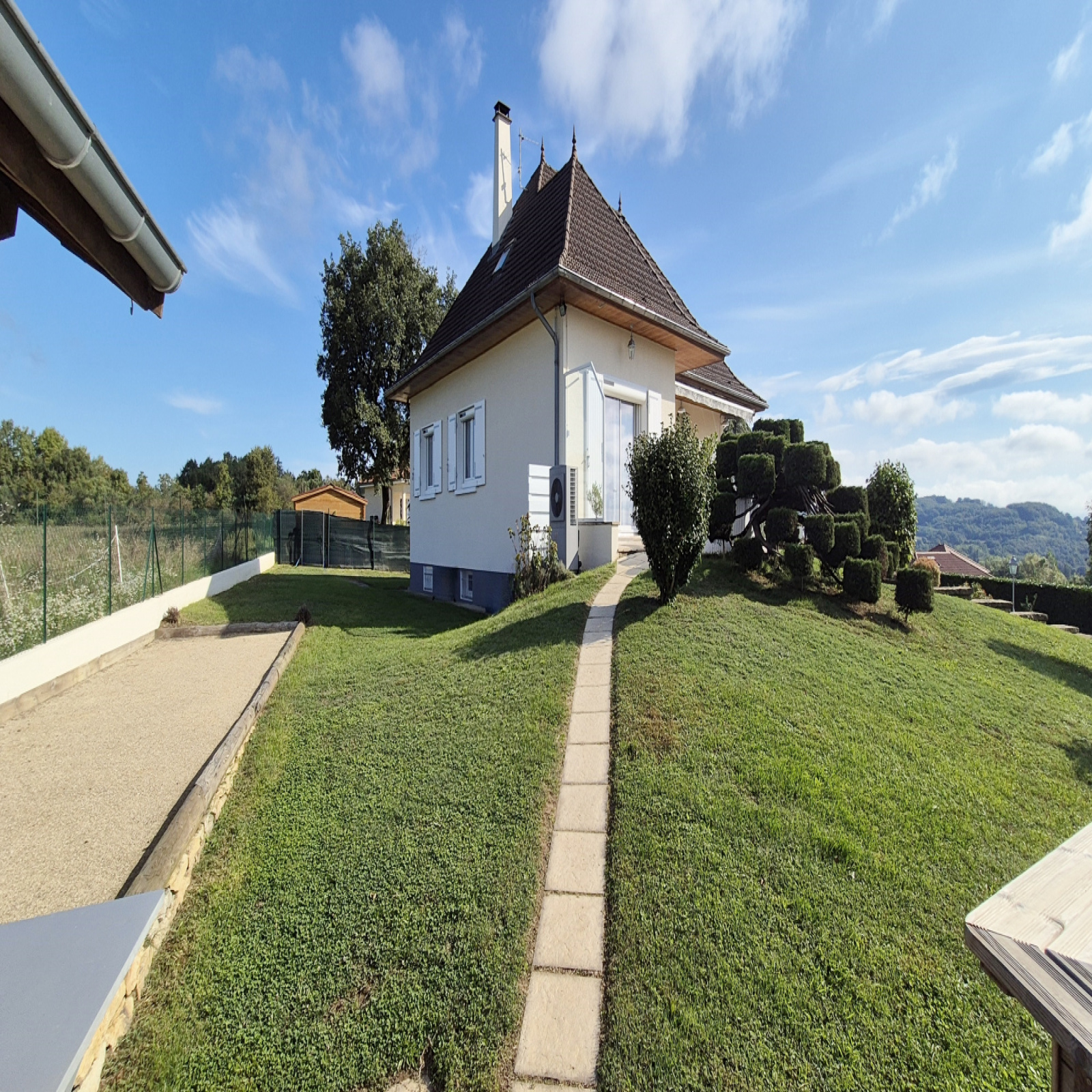 Le parc de la propriété est magnifiquement arboré, comprenant un abri de jardin de construction traditionnelle de 20 m², qui peut servir de terrasse couverte, attenant à un véritable jeu de boules et à un espace de jardin potager clos. L'entretien du gazon est entièrement géré par un robot, qui sera laissé avec le bien.