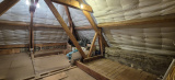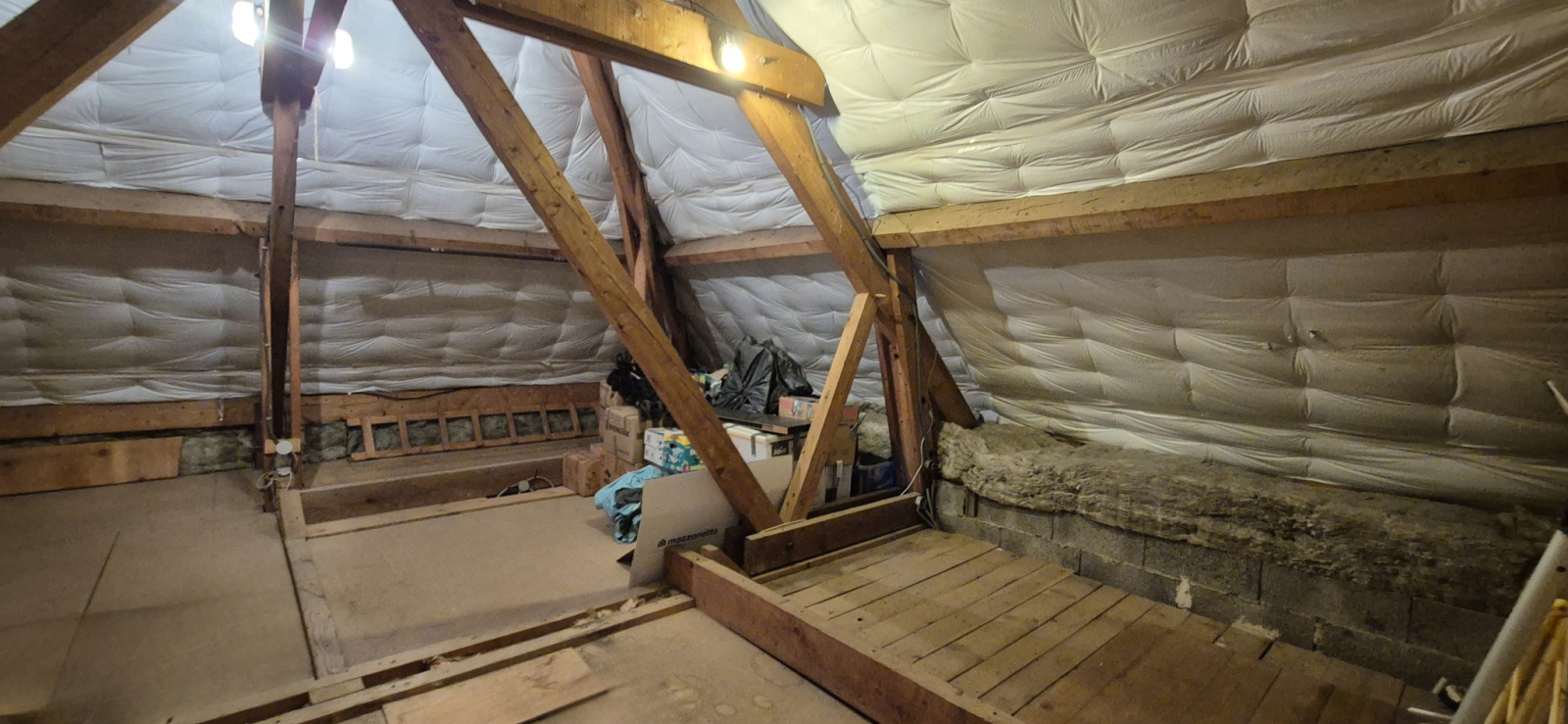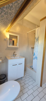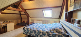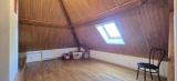 Au premier étage, un palier dessert deux chambres mansardées de 18 et 21 m², une salle d'eau avec toilette et un grenier de 25 m² (avec une hauteur sous plafond supérieure à 1,80 m), qui peut être exploité comme espace habitable.