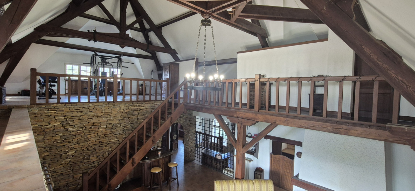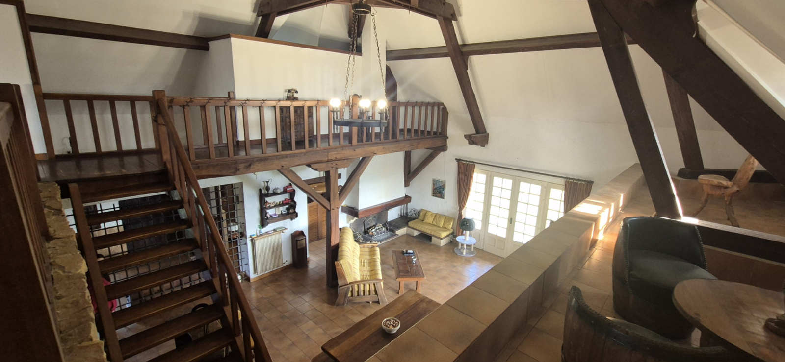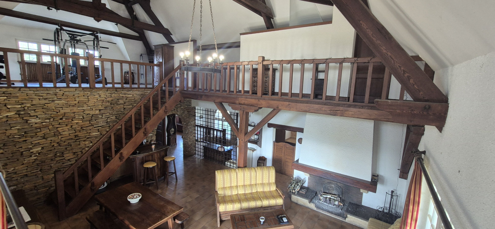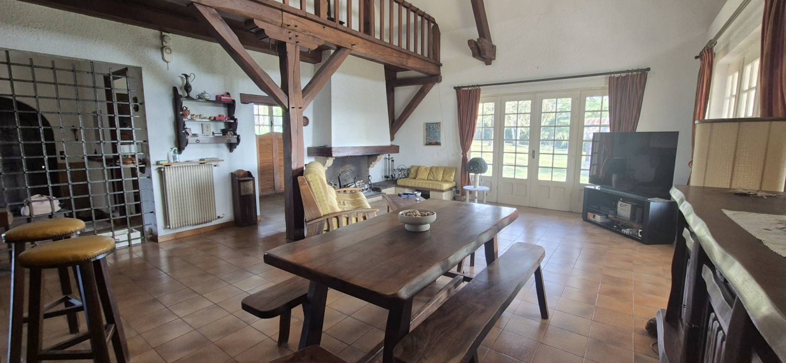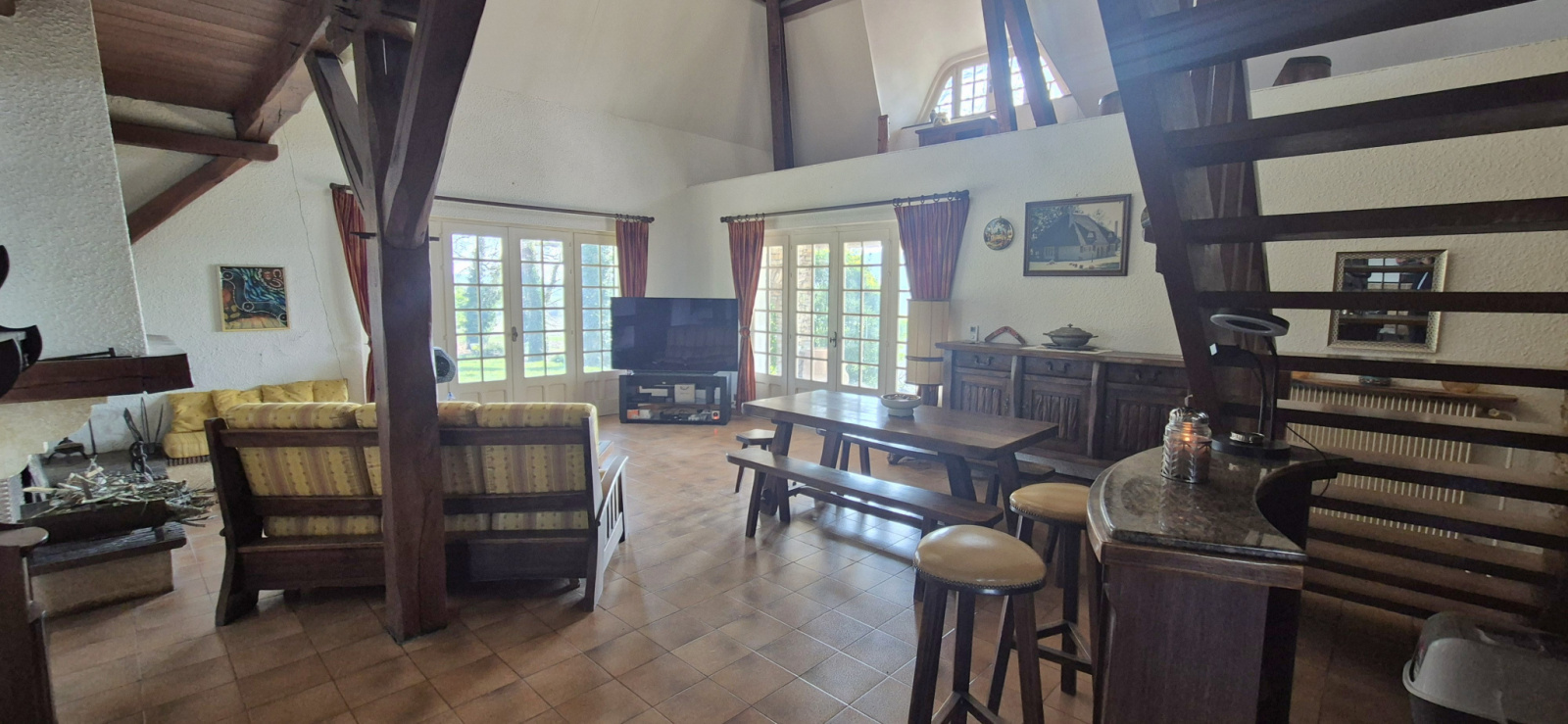 Dès l’entrée, vous découvrez un vaste hall avec plafond cathédrale culminant à 8,70 mètres, apportant un volume remarquable et une belle luminosité. L’espace de vie se compose d’un salon-séjour de 38 m², entièrement déplafonné et agrémenté d’une cheminée à foyer ouvert, ainsi que d’une cuisine de 12 m² attenante avec accès direct au séjour, favorisant convivialité et circulation entre les espaces.