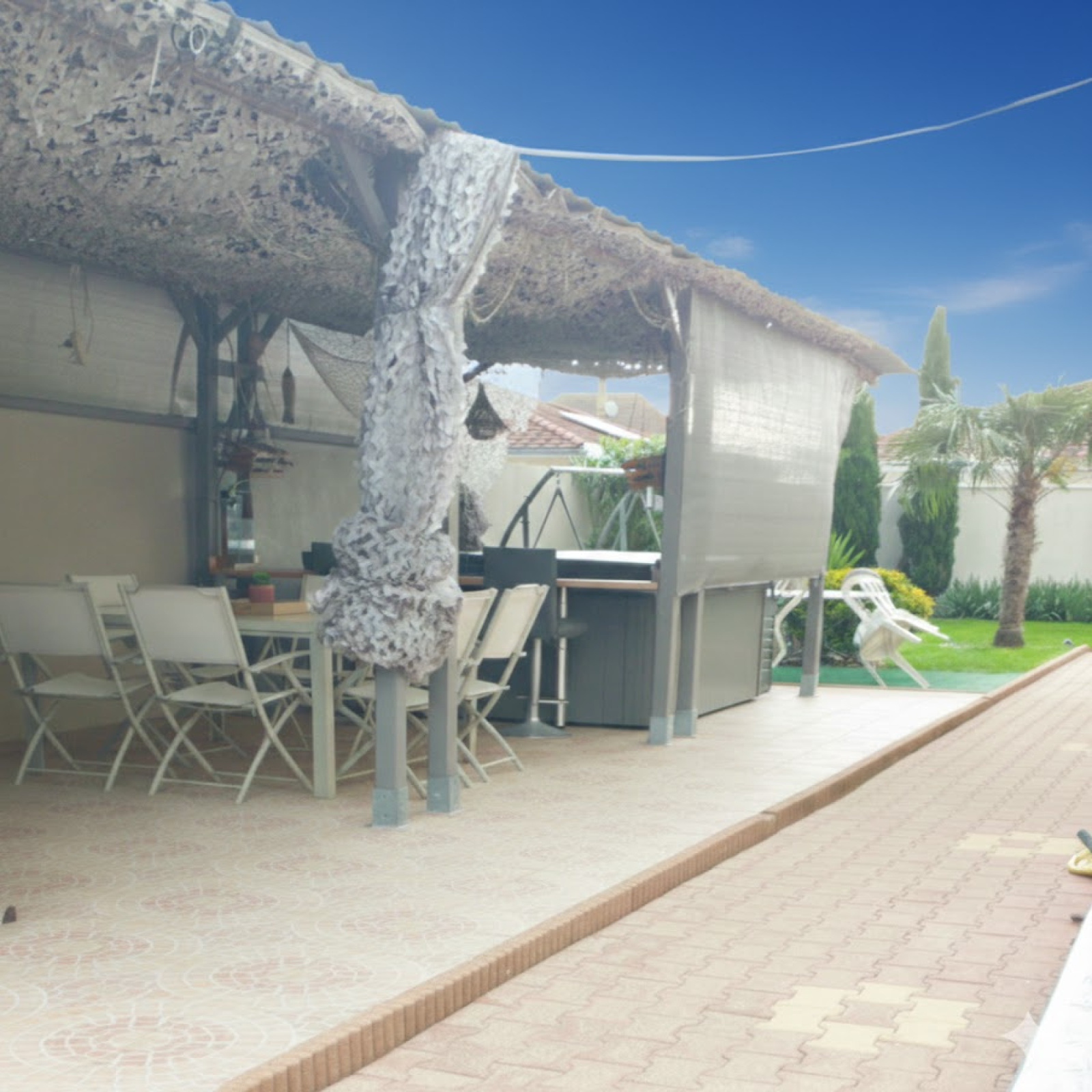 À l’extérieur, vous profiterez d’une cour pavée à l’avant et sur les côtés, d’une grande terrasse couverte de 34 m², d’un abri de jardin de 14 m², ainsi que d’un espace arrière offrant un beau potentiel d’aménagement.